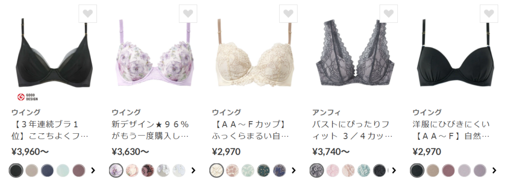 ワコール・トリンプ・PEACHJOHNなどのブランドからカジュアル系、プチプラアイテムまで幅広く並んでいて、サイズ・デザイン・価格を絞って探せるのが便利です。
