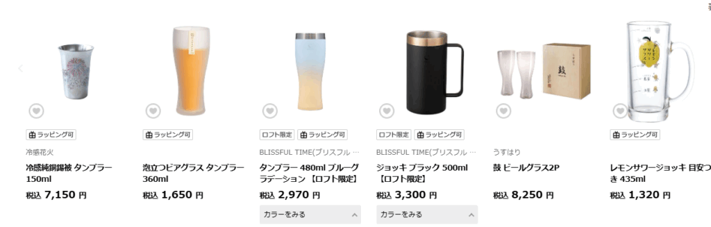 ロフトにも、ビアボールグラス付きは売っていませんが、いろいろな種類のビアジョッキが売っていました。