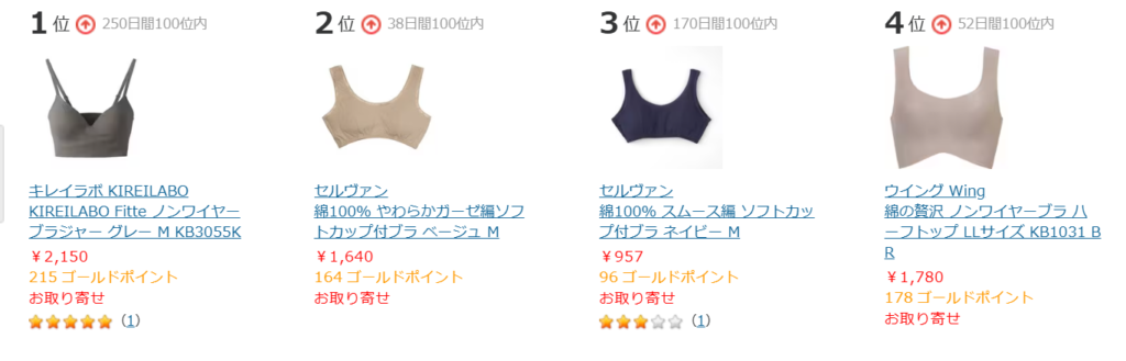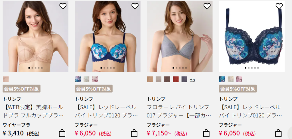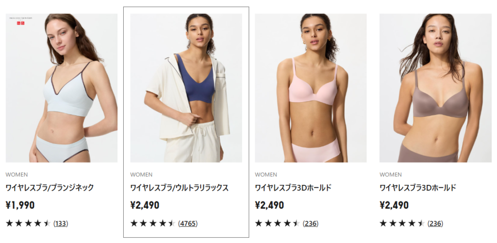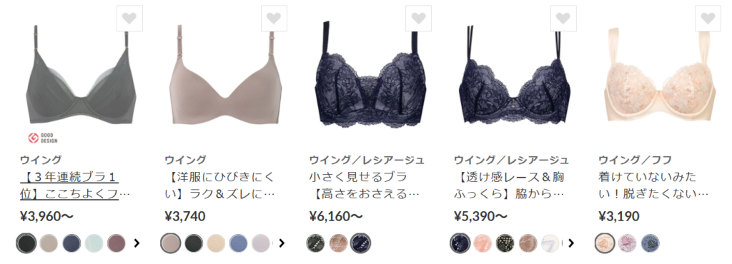 国内ブランドから機能性インナーまで幅広く掲載されており、サイズや価格帯を比較しながら選びやすいのが便利なところです。