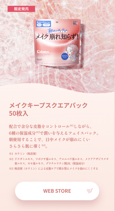 カラミーメイクキープスクエアパックを販売するロート製薬公式サイトでは、カラミーメイクキープスクエアパックが購入できます。