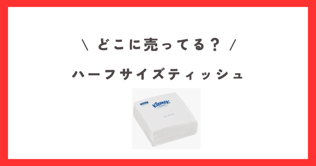 ハーフサイズティッシュは、主にネット通販で見つかることが多いようです。 また、スギ薬局などのドラッグストア、ドン・キホーテやスーパーにも、取り扱いありませんでした。 ただし、在庫状況は店舗によって異なるので、足を運ぶ前に電話確認すると安心... -