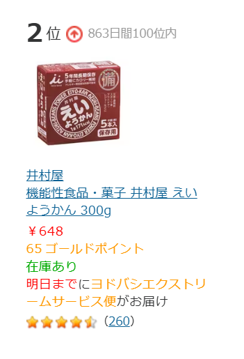 ビックカメラにも、丁稚羊羹は売っていませんが、防災用の非常食として羊羹が販売されています。