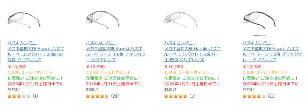 倍率やカラー、モデル違いが一気に比較できて、在庫があれば最短で届くのが強み。