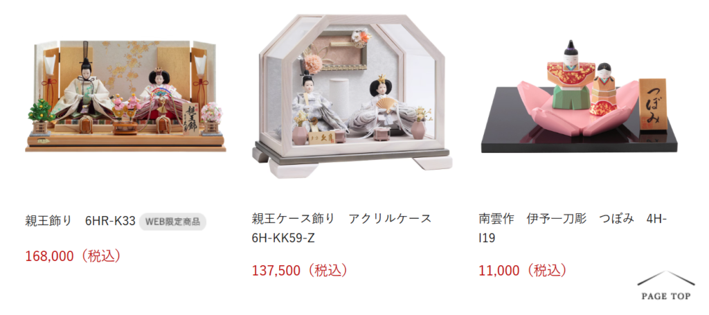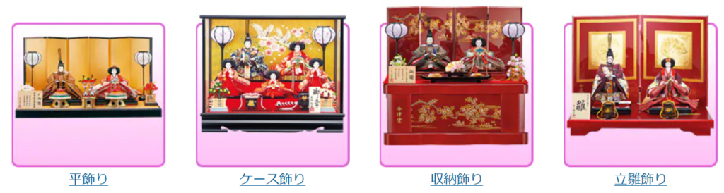 ケース飾りや親王飾りなど幅広くそろっており、サイズや価格を見比べながら選べます。