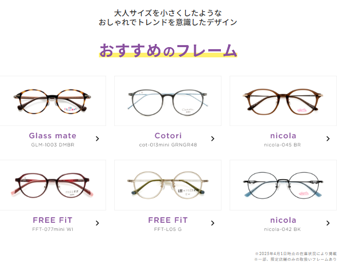 キッズ向けのフレームや度付き対応の商品などが掲載されており、サイズやデザインを見ながら探せます。