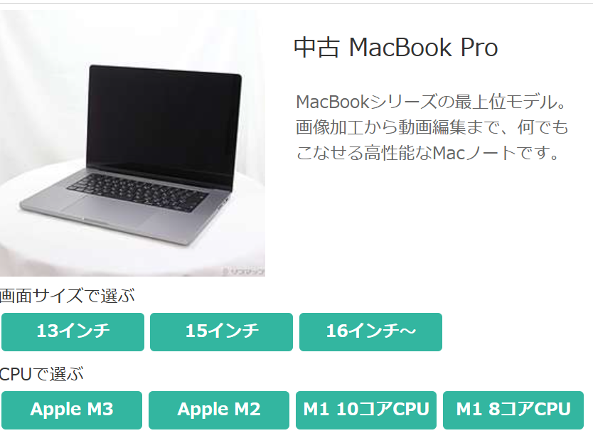 中古パソコン販売で定評のある家電量販店系リユースショップで、整備済みのMacBookが多数ラインナップされています。