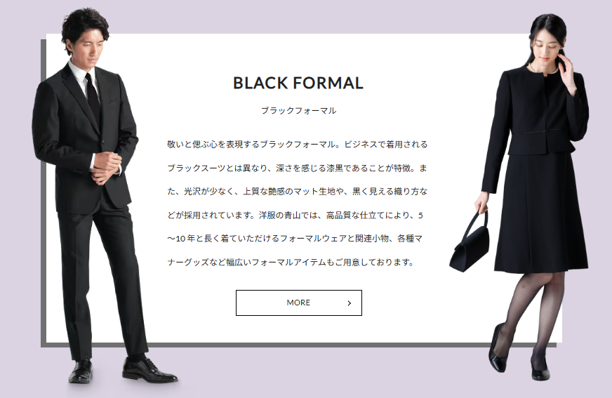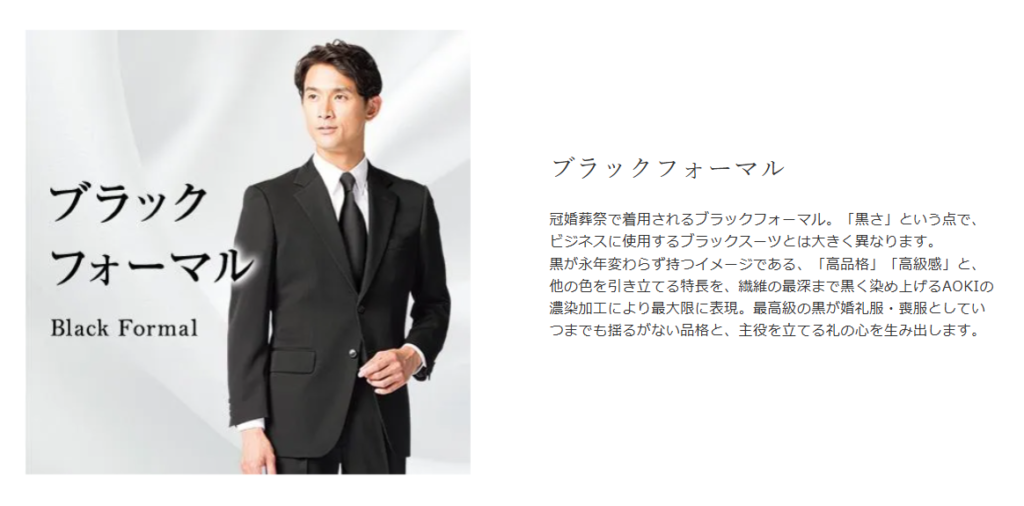 洋服の青山・AOKI・コナカは喪服を定番で扱い、サイズ展開やフィッティング、ネクタイ・バッグなど小物まで一式そろえやすいのが強み。