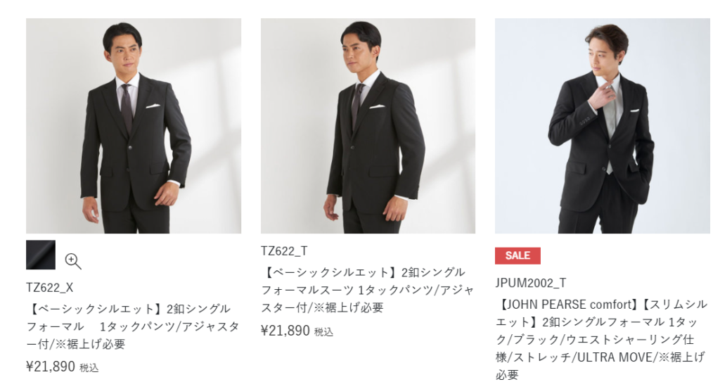 ネクタイやシャツなど必要な小物も一緒に選べるため、急な用意でも安心して準備できます。