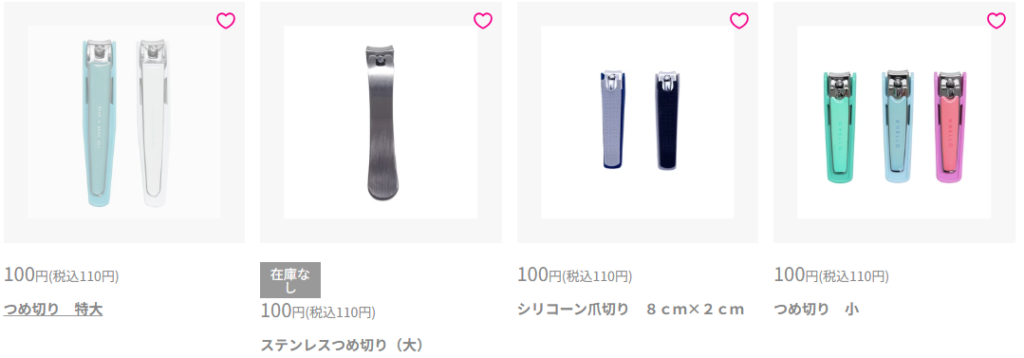 爪切りはドラッグストアをはじめ、100円ショップのダイソーやセリアでも手に入ります。