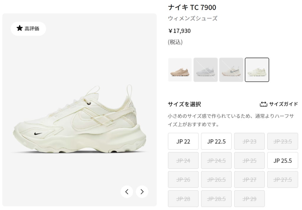 去年ツイッターで流行ってたナイキのTC7900、悩んでるうちにどこも売り切れて買えなかったんだけど、真っ白なら在庫が近くにあったから試してみたけど普段24だけど、24.5でジャストだったから25出してもらったけど横が細いのかずっと小指あたってて諦めた