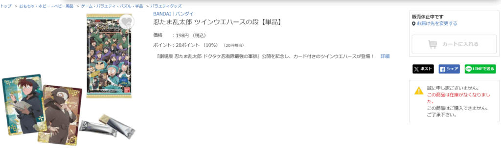 ビックカメラも、忍たまウエハースが売っていたのですが、現在は販売休止となっています。