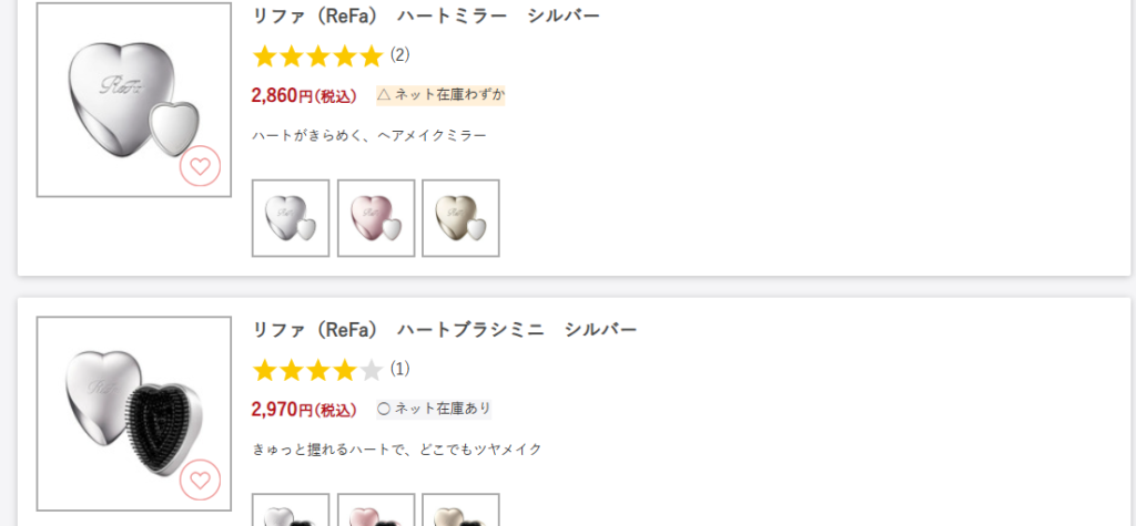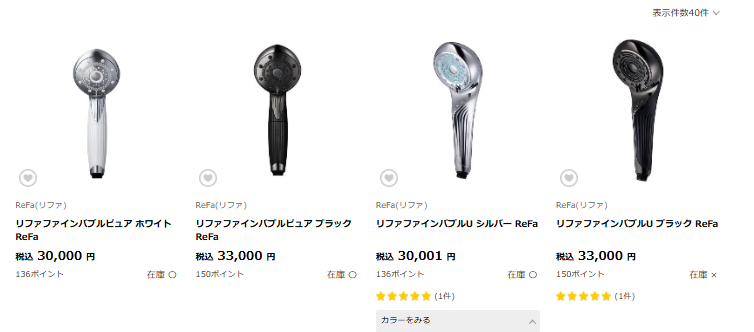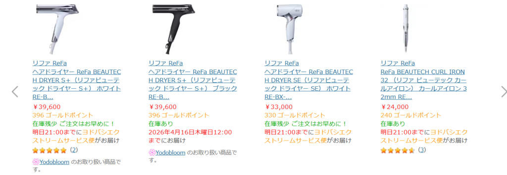 検索するとドライヤーやヘアアイロン、シャワーヘッドまで一通り出てきて、在庫のある商品をすぐ確認できるのが便利です。