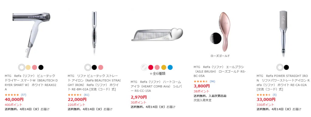 ドライヤーやヘアアイロン、シャワーヘッドまで幅広く並んでいて、ショップごとに価格や特典が違うのが分かります。