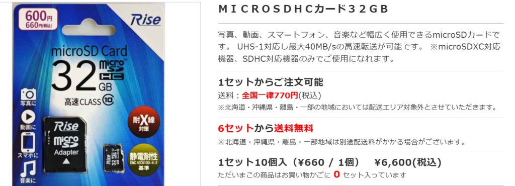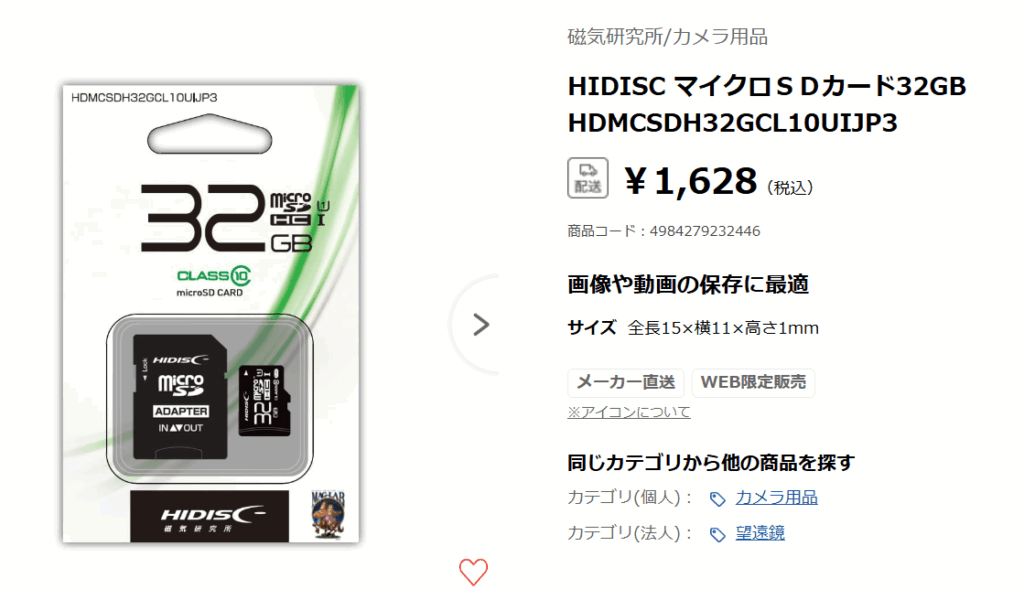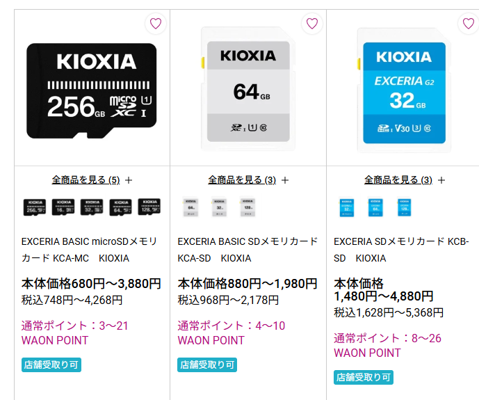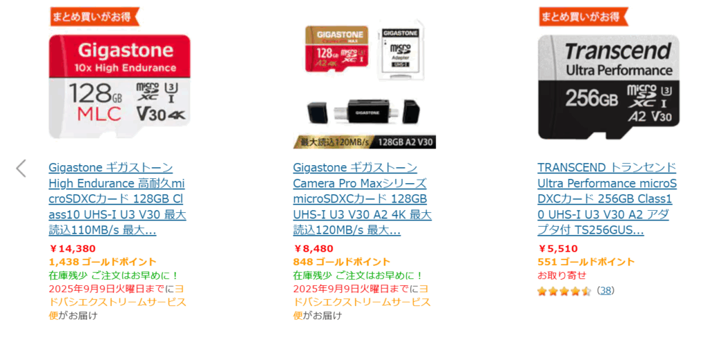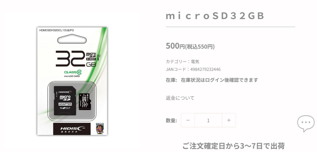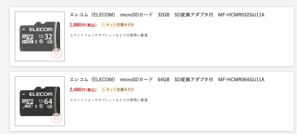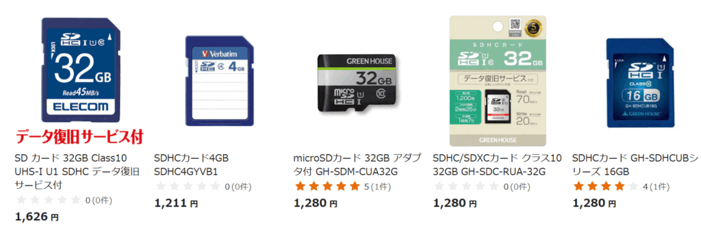 まずは100円ショップのダイソーでは、32GBのmicroSDが500円程度で売っていることがあり、手軽に試せる選択肢として便利。