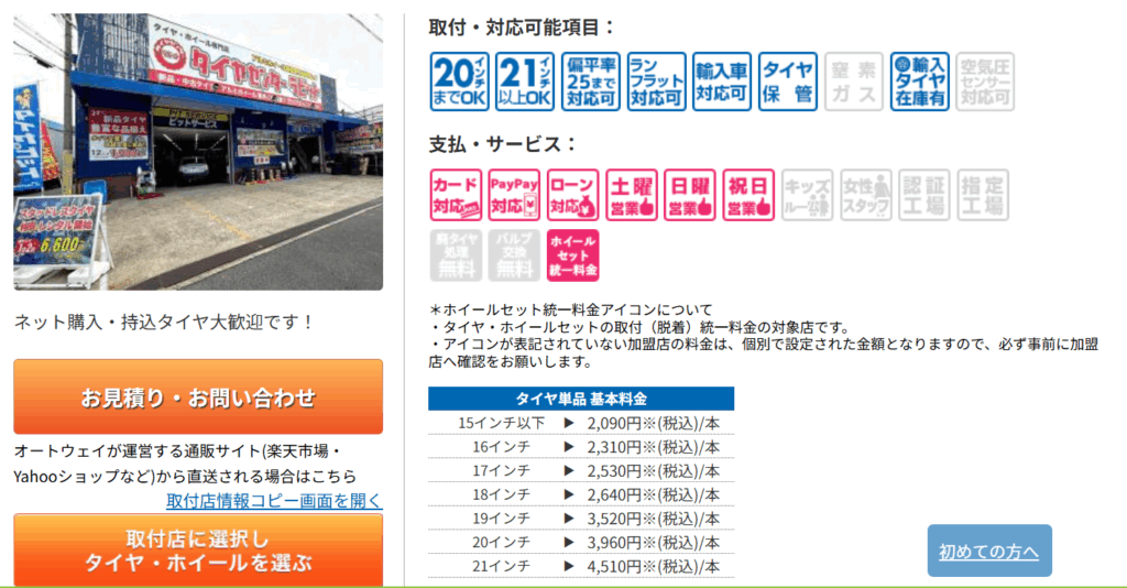 取り付けもその場でOKです。タイヤ専門店は品揃え豊富で、車種や用途にピッタリ合うものを提案してくれます。