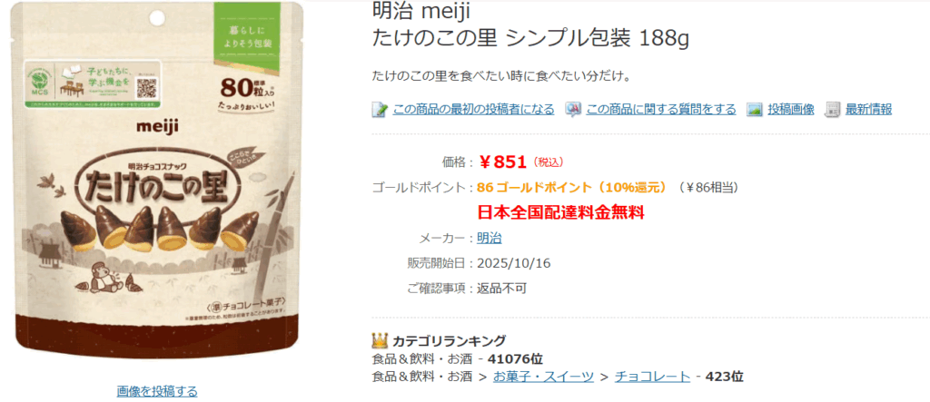 ヨドバシカメラにも、たけのこ里大容量は売っていましたが、現在は販売休止となっています。